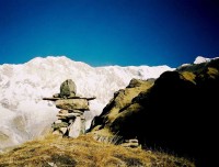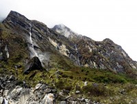 We start descending to Choomrong village and enter the valley in between massive Mount Fishtail (6997m) and Hiuchuli Peak (6441m) through dense rhododendron forest, small teahouses and barren rugged terrains leading straight to tower of Annapurna massif bordered by glaciers.